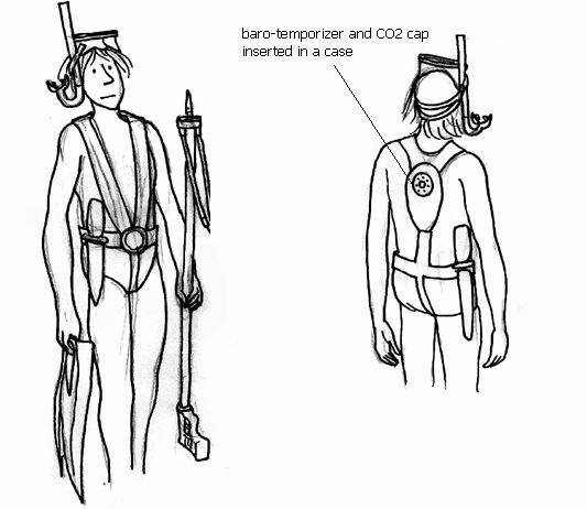 As the air chest stays on the surface (diving bottles made in light alloys can float), other people on a boat can watch over the diver. It's working in "semi-apnea". Technically, it's just called an narghile, but psychologically, it allows everyone to dream he's the hero of "The Big Blue". The harness is equiped with the baro-temporizer, that starts automatically to countdown as the diver stops breathing. The device will so be set for shorter deadlines, e.g. 60 seconds.