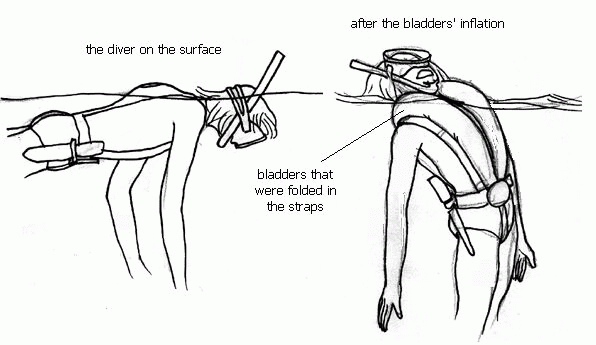 cap, which brings the diver back to the surface, face upside, by inflating the