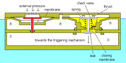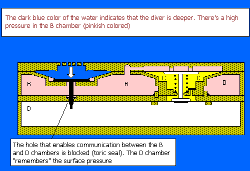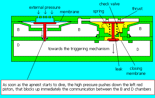 Initially (before the dive), the system, that is supposed to be located between the diver's scapulas, is at water level. The external pressure is exerted through the holes shown on the drawings. The system is on contact with the external environment by a rubber membrane similar to those of diving bottles' regulators. This membrane is interdependent with a mobile part (red-colored) that has the rotation symmetry. The system comprises several chambers. We'll call B the upper chamber and D the lower one. In normal circumstances, without high pressure due to the diver's descent, the membrane is flat. The turret, there colored in red, is in the position you can see on the drawing. Its awl isn't engaged and the B chamber communicate with the D one, so they've got the same pressure.