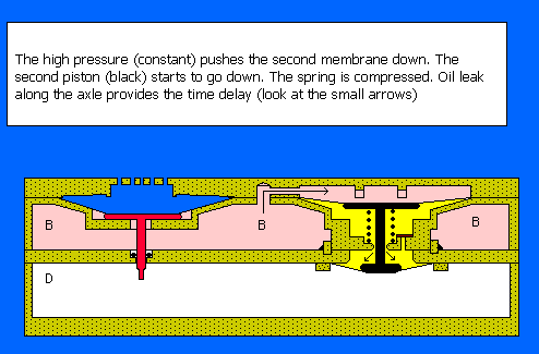 The drawing above shows the second mobile part going down. The small arrows show the oil flow. The general design of the system determines the time it will take for the second piston to reach its lower thrust.