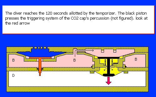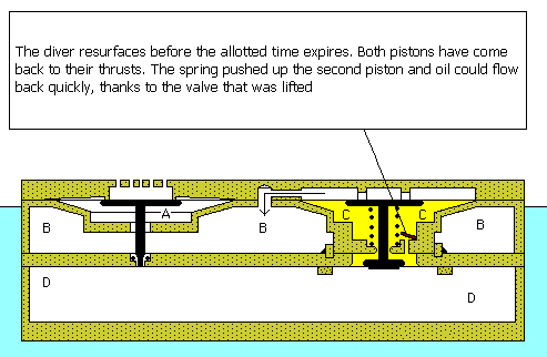 We've drawn the device after the return to the surface. Please note that the countdown goes on until the diver goes back to the surface, or very close to it. That's only at a depth of less than one meter that the left mobile part unblocks the communication between the B and D chambers. The right spring tends the mobile part to go back to its original position. This movement is very quick, because the oil can lift the valve up (look at the drawing).