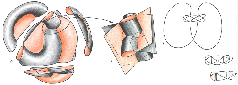 A gauche on a opéré des coupes dans le modèle. Au centre la façon dont les deux cylindres dont, localement, la section affecte la forme de la lettre grecque "gamma" se sont interpénétrés. On se rappelle que la catastrophe de création de "tranches de mandarines" s'opérait en coupant une "bûche" avec deux plans formant un dièdre. Chacune des structures cylindriques dont la section est en "gamma" comporte à la fois la section arrondie et le dièdre. Regardez avec attention la figure i. En j on a dessiné l'ensemble d'auto-intersection. La portion de courbe fermée la plus grande provient de la première "catastrophe du coude" qui avait transformé la sphère en "canot pneumatique". Après création des deux tranches de mandarines on obtient un ensemble plus complexe dont j' est un sous-ensemble. En j" on voit que cette structure peut être comparée à l'assemblage de deux "tranches de mandarine" sur deux arêtes d'un tétraèdre, non adjacentes.
