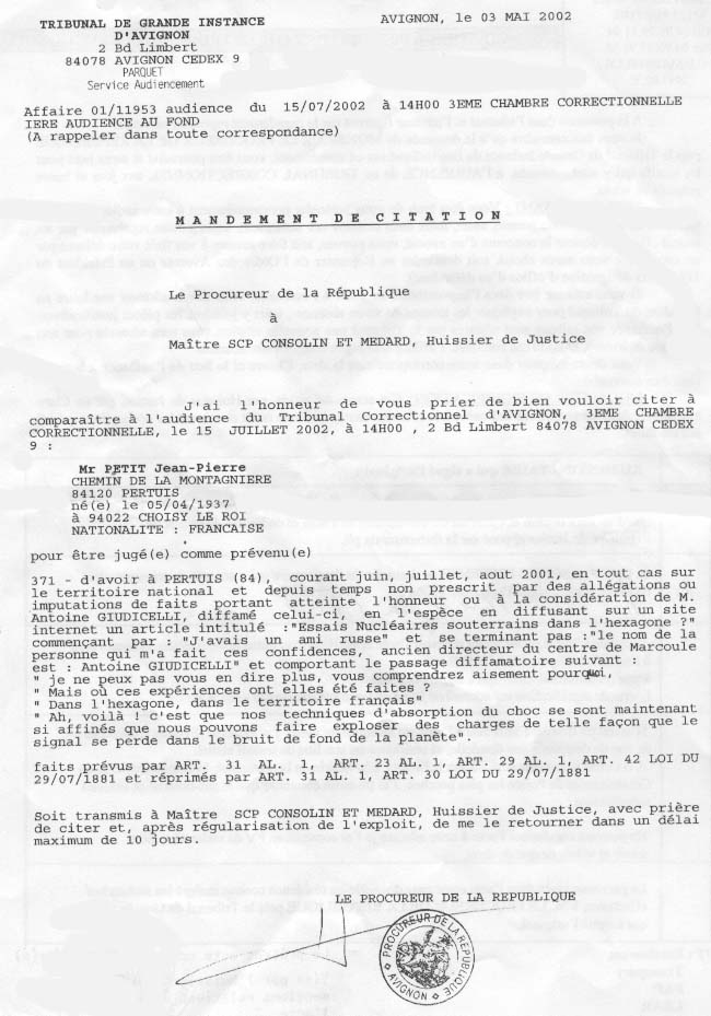 Ce procès étant un procès public qui se tiendra le lundi 15 juillet à 14 heures au nouveau tribunal d'Avignon, 3° chambre correctionnelle, 2 Bd Limbert, Avignon, il est licite de procéder sur ce site à l'affichage de la citation à comparaître, ci-après. Toute personne, y compris des journalistes, qui souhaiterait assister au procès pourra donc le faire en se présentant simplement à l'audience. Ci après la reproduction de la citation à comparaître :