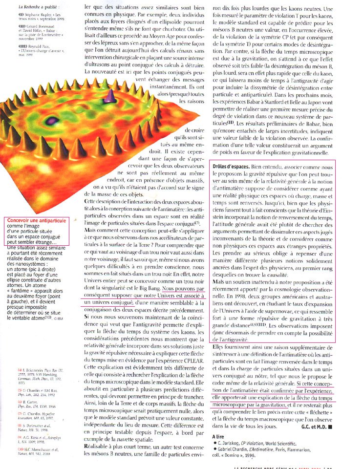 ...Dans ce numéro on trouvera, page 26, un article signé par Gabriel Chardin et Marc Déjardin, physiciens au Commissariat à l'Energie Atomique.Les copies de pages qui suivent suffisent à établir le fort lien de parenté entre ces idées, présentées par ces auteurs que étent les leurs et mes propres travaux. Ceci fait suite à Sciences et Avenir de février 2001 ou à Pour la Science de mars de cette même année. Décidément, on nage maintenant dans les univers parallèles, jumeaux, dans les flèches du temps inversées, dans l'antimatière. Se souvenir que mon premier travail publié en cosmologie théorique, en 1977, avait pour titre "Univers Enantiomorphes à flèches du temps opposées" (Comptes Rendus de l'Académie des Sciences de Paris, présenté par André Lichnérowicz). On pourrait se demander comment il se fait que ces doctes revues n'aient poas songé une seule seconde à faire appel à mes services ou simplement aient songé à citer ou à faire citer mes propres travaux en la matière, pourtant sacrément abondants depuis 15 ans et publiés dans des revues de qualité, à comité de lecture. La réponse m'a été fournie en mars dernier, téléphoniquement, par Larousserie, auteur du papier paru dans Sciences et Avenir :