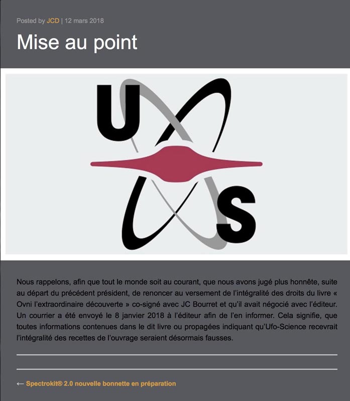 - A cet effet j'ai donc écrit deux livres : OVNI, LE MESSAGE (2009) et OVNI ET SCIENCE (2010) qui ont été imprimés par l'association et vendus par correspondance à son profit pendant huit ans. Les internautes ont également fait des dons et on peut estimer ce que ces opérations ont rapporté à l'association environ 50.000 euros . Je n'ai jamais reçu de relevés de comptes du trésorier, y compris quand j'ai démissionné où, demandant à savoir ce que je laisserai en partant, il me fut répondu "comme vous êtes démissionnaire nous ne sommes nullement tenu d'accéder à votre requête".