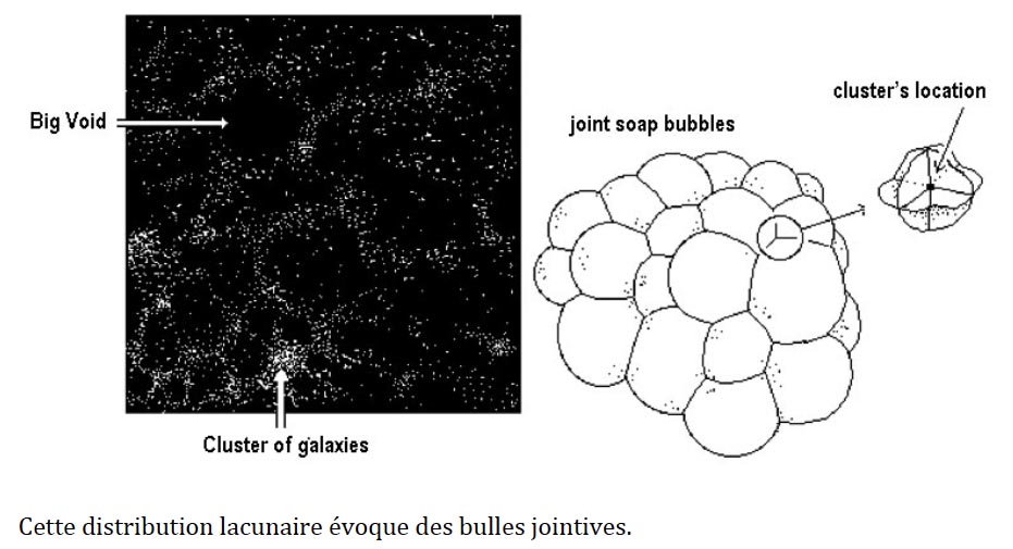 - Qu'est-ce que représente cette image ? - Tsvi Piràn a décodé les observation astronomique, qui font état de grands vides, d'une centaine de millions d'années-lumière de diamètre. Ce sont ces grands vides qui sont ici représentés sous forme de sphères de couleur, sur fond noir. - Ceux-ci semblent absents au milieu de la figure. - Dans ce secteur, qui correspond au plan de notre galaxie, la voie lactée, toutes les mesures, toutes les observations manquent. Tout est occulté par les poussières. Ce modèle correspond à ma propre vision des chose, celle d'une matière localisée sur des "bulles jointives".