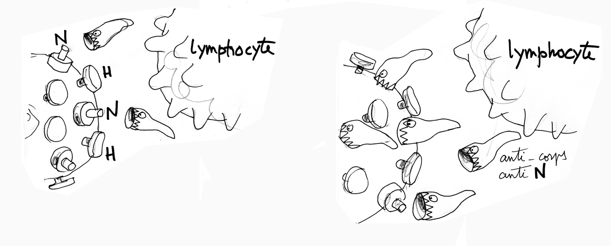 Pourquoi l'efficacité des vaccins est-elle souvent contestable ? Parce que les virus mutent. Le système immunitaire réagit bien mais sécrète les anticorps correspondant aux antigènes-spicules (Ha, Nb) , qui ne seront peut être pas ceux qui tapisseront la capsule du nouveau virus , par exemple (Hc, Nd). alors l'efficacité du vaccin sera ... nulle, parce que les " chapeaux " ne pourront pas s'adapter sur les spicules du nouveau virus.